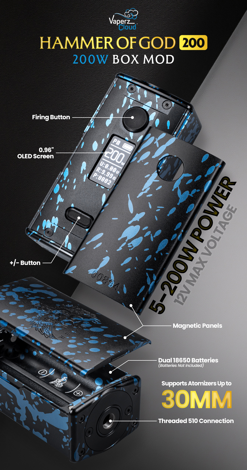 Il chipset VC Hot Swap 200 combina la sicurezza di una box mod elettronica con le prestazioni di una box mod meccanica. La Hammer of God 200 dispone di un display OLED a colori da 0,96 pollici con colori personalizzabili. Supporta atomizzatori con un diametro massimo di 30mm con attacco 510 regolabile manualmente